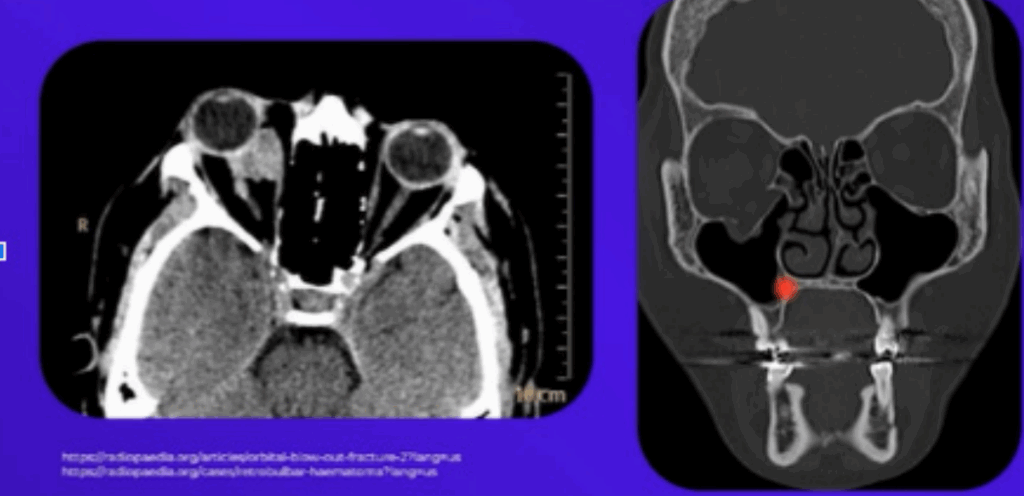 - Fratura Orbital: A órbita é composta por 7 ossos, sendo as paredes medial e inferior as mais frágeis. A fratura do tipo “Blow-Out” ocorre por um aumento súbito da pressão intraorbital, que leva à fratura dessas paredes frágeis e herniação do conteúdo orbitário para os seios maxilar e etmoidal. Os sinais clássicos incluem diplopia, enoftalmia (afundamento do globo ocular) e restrição da motilidade ocular, especialmente na elevação do olhar, devido ao encarceramento do músculo reto inferior.