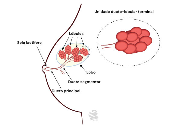 Para entender a patologia, precisamos revisitar a anatomia microscópica. A mama organiza-se em lobos e ductos que culminam na Unidade Ducto-Lobular Terminal (UDLT). É nesta estrutura, a menor unidade funcional da mama, que a grande maioria das lesões precursoras e carcinomas se originam.