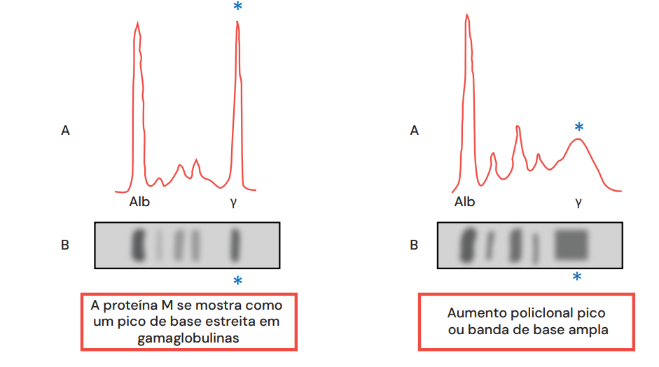 O método de triagem para essas condições é a eletroforese de proteínas séricas. Nela, a Proteína M se apresenta como um pico de base estreita na região das gamaglobulinas (pico monoclonal), diferentemente do aumento policlonal (visto em infecções, hepatopatias ou doenças autoimunes), que se manifesta como uma banda de base ampla.