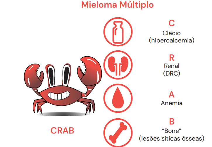 - Diagnóstico: Requer a presença de >10% de plasmócitos na medula óssea (ou um plasmocitoma) associado a um ou mais dos critérios CRAB. O diagnóstico também pode ser fechado na ausência de CRAB se houver marcadores de alta carga tumoral (ex: >60% de plasmócitos na medula).