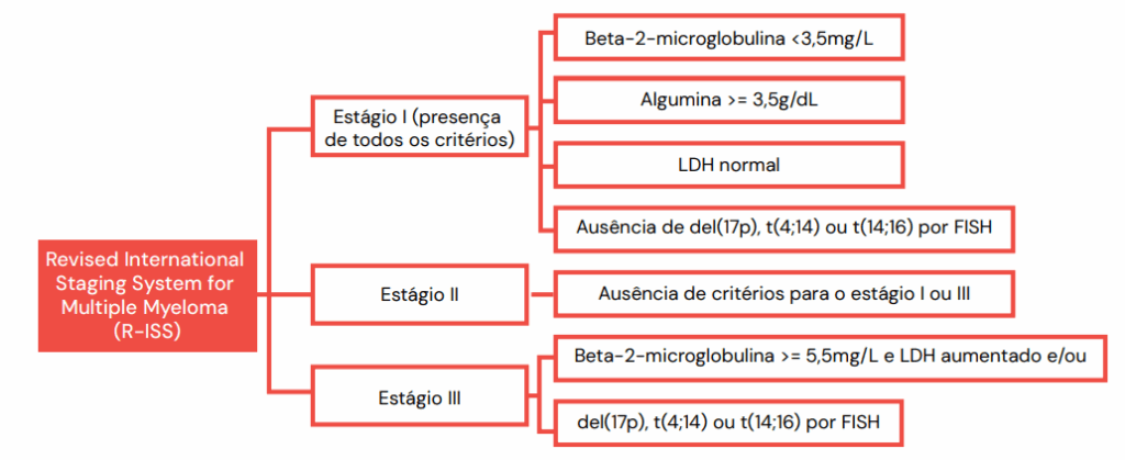 - Estadiamento: Utiliza o sistema R-ISS, que classifica o risco com base nos níveis de B2-microglobulina, albumina, LDH e a presença de alterações genéticas de alto risco por FISH.