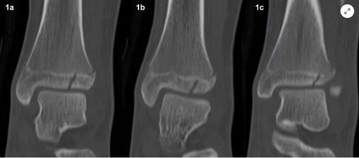 Reconstrução tomográfica do tornozelo com a técnica MPR no plano coronal (de anterior para posterior). Fonte: https://www.mskrad.com.br/post/fratura-de-tillaux-juvenil