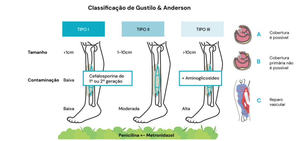 - Fraturas Expostas (Gustilo e Anderson): Define risco de infecção e necessidade de cobertura.
