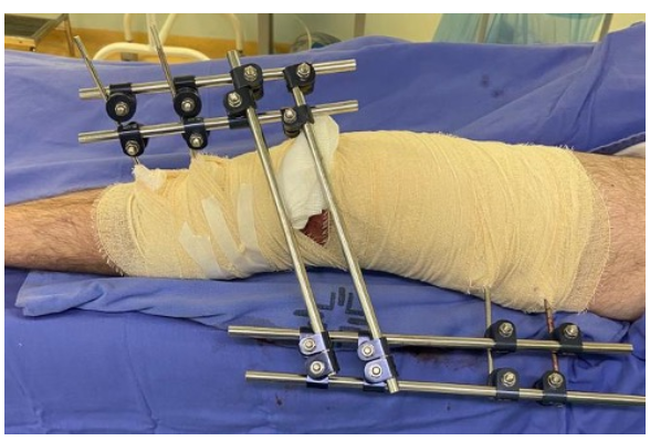 Foi realizado tratamento provisório com fixador externo transarticular para controle dos tecidos e planejamento cirúrgico. Fonte: https://drleonardorochathomaz.com.br/tratamento-de-fraturas-do-planalto-tibial/