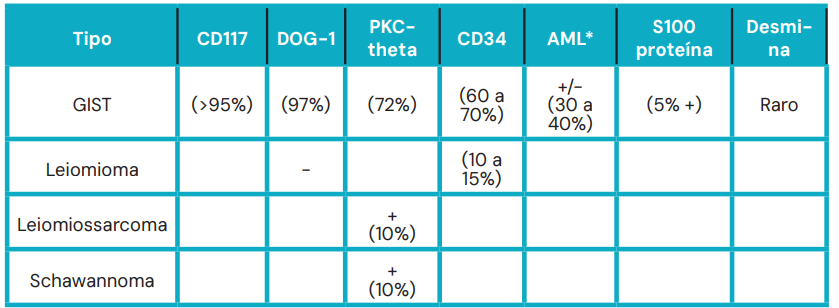 A diferenciação entre GIST, Leiomioma e Schwannoma é mandatória. O GIST caracteriza-se pela positividade para CD117 (c-kit) em >95% dos casos e DOG-1 (97%).