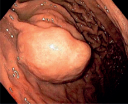 A apresentação endoscópica clássica é de uma lesão subepitelial, recoberta por mucosa íntegra, podendo apresentar ulceração central (umbilicação). O diagnóstico definitivo, contudo, é imuno-histoquímico.
