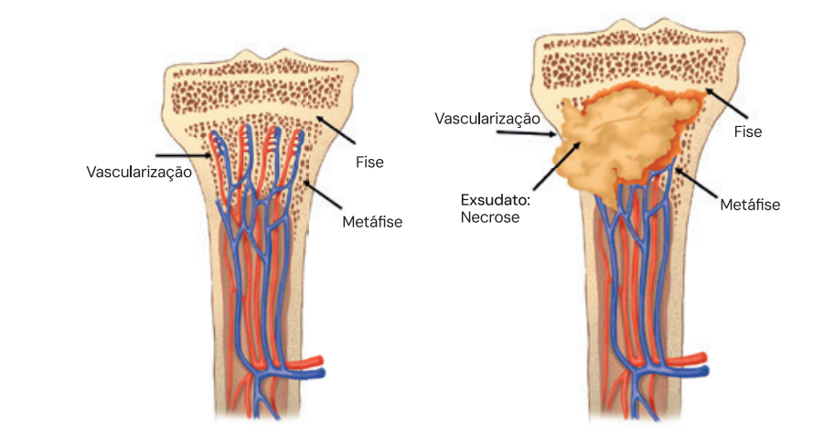 Osso saudável (esquerda) e osso com exsudato e necrose (direita). Fonte: Acervo de aulas do Grupo MedCof.