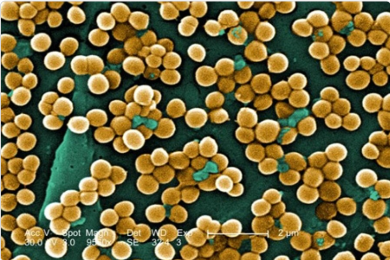 Bactéria Staphylococcus aureus com forma esférica e cerca de 1 micrômetro de diâmetro.