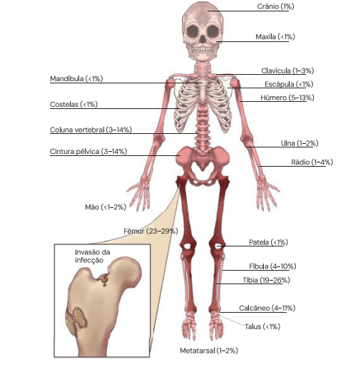 Mais comum em ossos longos, acometendo principalmente metáfises, especialmente fêmur e tíbia. Adaptado de: Acute Osteomyelitis in Children. Peltola, et al.
