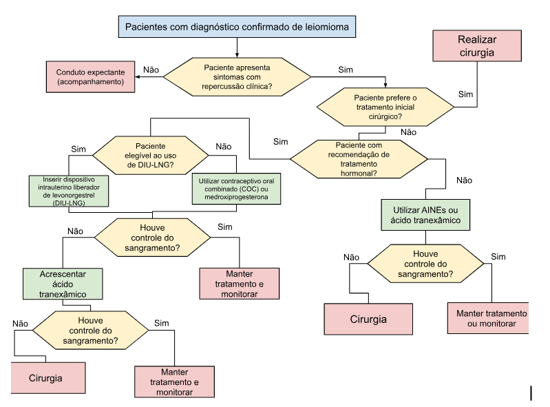 levonorgestrel), acetato de medroxiprogesterona, análogos do GnRH com ou sem add-back therapy, miomectomia (histeroscópica, laparoscópica ou abdominal), histerectomia e embolização das artérias uterinas (EAU).