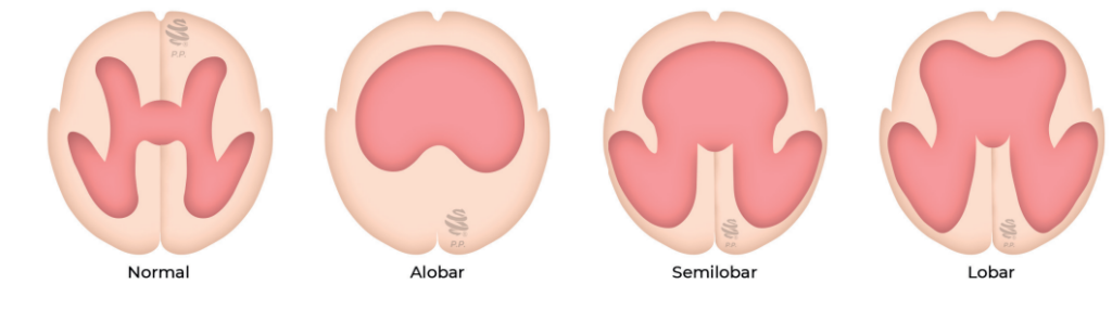 Falha na clivagem (separação) dos hemisférios cerebrais. Pode ser Alobar (fusão total – mais grave), Semilobar ou Lobar. Frequentemente associada a defeitos faciais (ciclopia, fenda labial central).