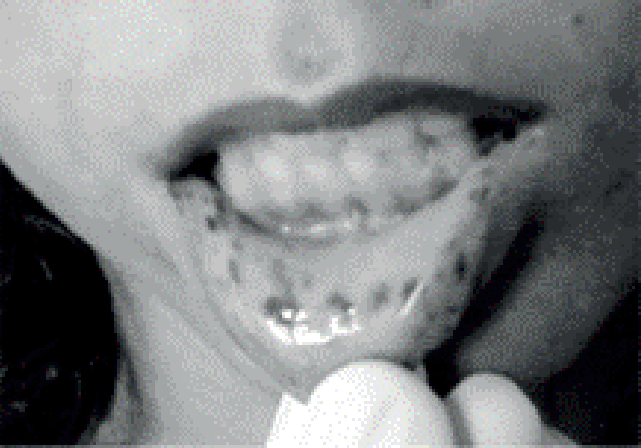 Mucosa oral com presença de lesão melanocítica. Fonte: ANDRADE, Aderivaldo Coelho de et al. Síndrome de Peutz-Jeghers: relato de caso. Rev. Col. Bras. Cir. [online]. 2008, vol.35, n.3 [cited 2020-08-30], pp.210-211. Available from: . ISSN 1809-4546. https://doi.org/10.1590/S0100- 69912008000300015.C