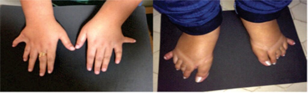 - Quadro Clínico: Hipotonia neonatal grave (“floppy baby”) com dificuldade de sucção, seguida por hiperfagia avassaladora a partir dos 2-3 anos, obesidade mórbida, hipogonadismo, baixa estatura, mãos e pés pequenos (acromicria), olhos amendoados e déficit cognitivo.