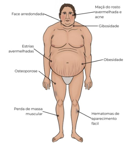 - Sinais: Obesidade centrípeta, face de lua cheia, giba dorsal, estrias violáceas largas (>1 cm), pletora facial, hipertensão e interrupção abrupta do crescimento.