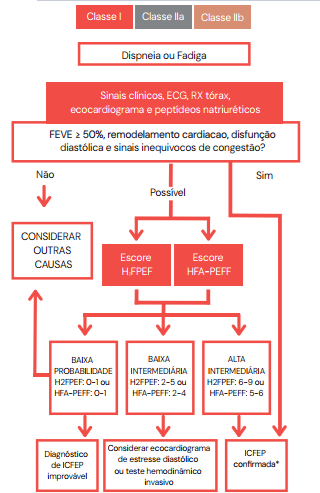 O diagnóstico de ICFEp ($FEVE \ge 50\%$) é desafiador, pois os sinais e sintomas são indistinguíveis da ICFEr. Em casos de dúvida, escores clínicos como o H2FPEF são ferramentas úteis.