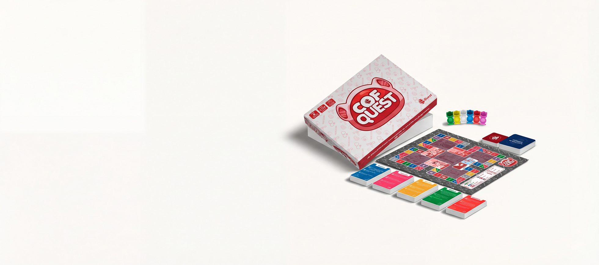 O CofQuest é um tabuleiro com perguntas sobre Clínica Médica, Cirurgia, Pediatria, Ginecologia e Obstetrícia, e Medicina Preventiva.